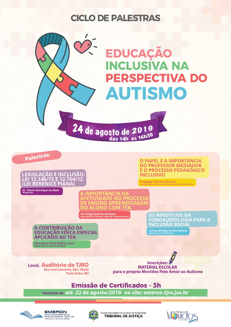 A “Educação Inclusiva na Perspectiva do Autismo” é o tema do ciclo de palestras a ser realizado no dia 24 de agosto, das 14h às 17h, no auditório do edifício-sede do Tribunal de Justiça de Rondônia (rua José Camacho, 585, Olaria). O evento contará com a participação do juiz Flávio Henrique de Melo, que falará sobre Legislação e Inclusão: Leis 13.146/15 e 12.764/12 (Lei Berenice Piana). As inscrições podem ser realizadas até 22 de agosto pelo site da Escola da Magistratura do Estado (Emeron), no menu Inscrições, ou pessoalmente, no dia do evento.