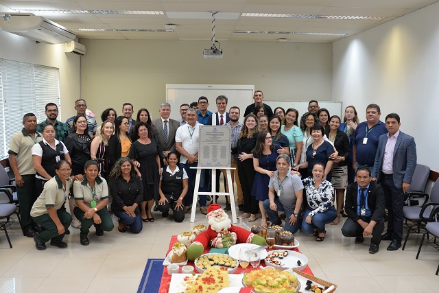 Encerrando a reunião, a direção entregou uma placa com o nome de todos os participantes do biênio, descerrada pelos servidores mais antigos em atuação, que será afixada na galeria da Escola. A manhã foi encerrada com uma confraternização entre os servidores e a direção.