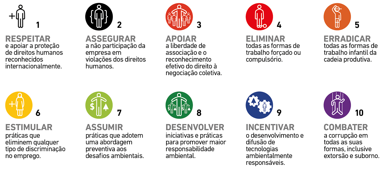 Possui dez princípios que o fundamentam e se derivaram da Declaração Universal de Direitos Humanos, da Declaração da Organização Internacional do Trabalho sobre Princípios e Direitos Fundamentais do Trabalho, da Declaração do Rio sobre Meio Ambiente e Desenvolvimento e, também, da Convenção das Nações Unidas contra a Corrupção. São eles: