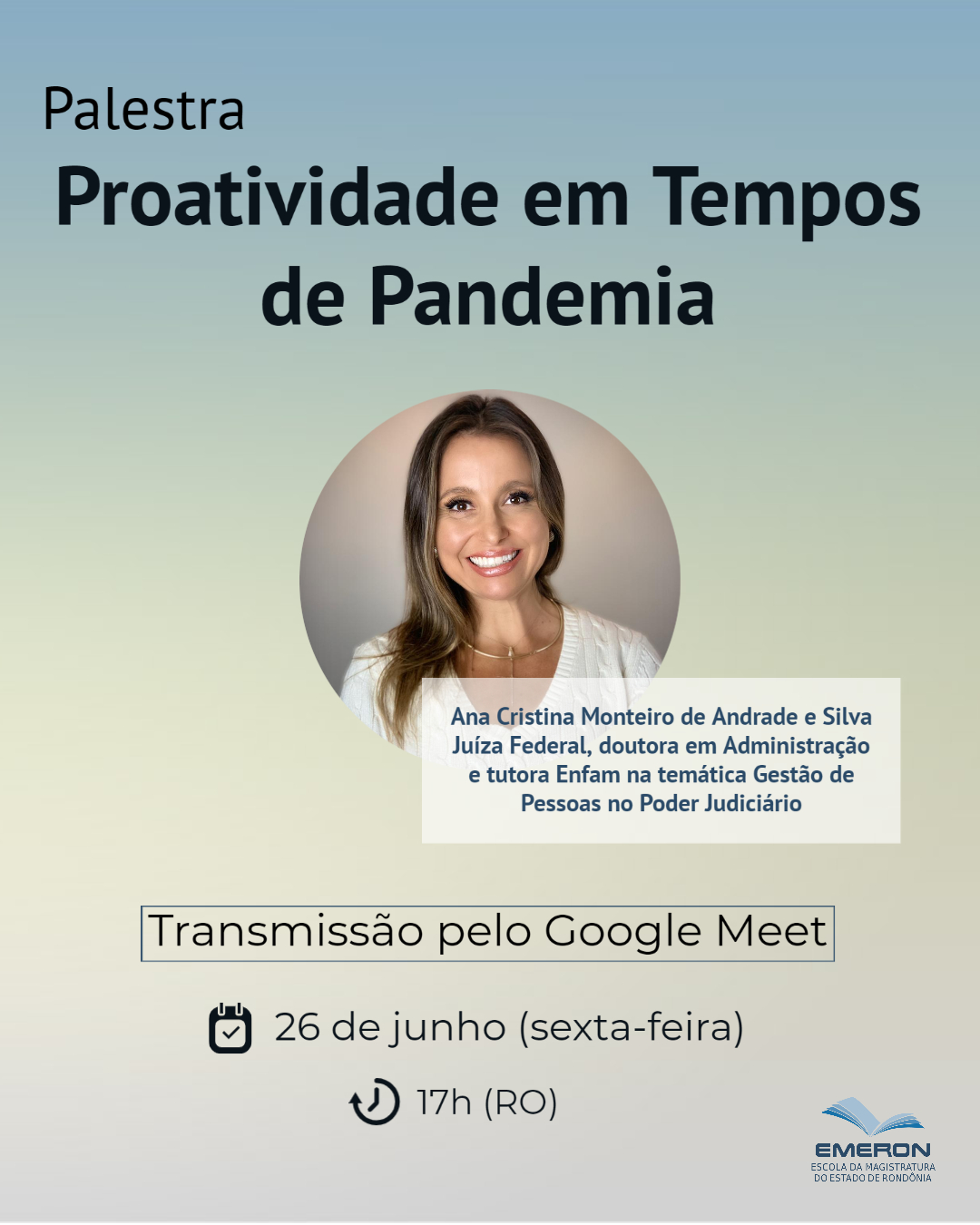 Após a publicação da instrução nº 2/2020 no Diário da Justiça do último dia 19, que normatiza as ações educacionais em ambiente virtual no período de distanciamento social, a Escola da Magistratura do Estado de Rondônia (Emeron) realizará sua primeira palestra digital. Com o tema “Proatividade em Tempos de Pandemia”, o evento ao vivo acontece na próxima sexta-feira (26), às 17h, e é destinado a magistrados e servidores do Poder Judiciário de Rondônia.