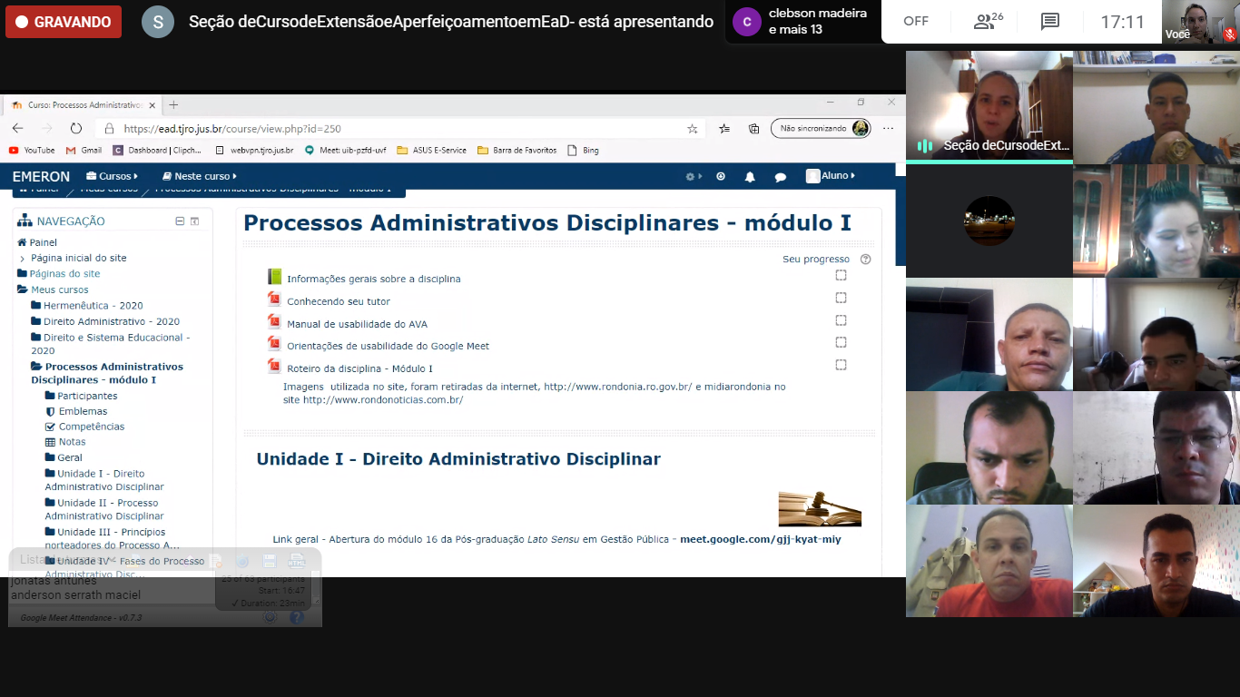Após um intervalo de quatro meses e readequação do cronograma, devido à pandemia do coronavírus, a pós-graduação lato sensu da Escola da Magistratura de Rondônia (Emeron) em Gestão Pública, voltada à Polícia Militar estadual (GEP-PM), retornou às aulas nos dias 3 e 4 de julho, agora na modalidade de Educação a Distância (EaD). A adaptação foi necessária para a continuidade do curso, em função da suspensão das atividades presenciais na Emeron desde a segunda quinzena de março, e está em conformidade com a instrução nº 2/2020, publicada no Diário da Justiça do dia 19 de junho.