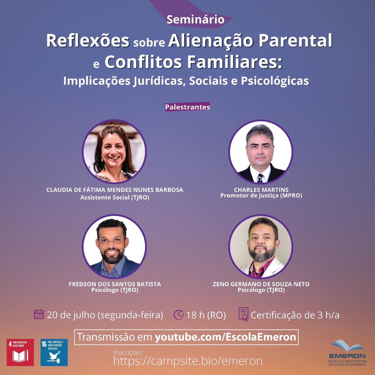 No dia 20 de julho, a Escola da Magistratura do Estado de Rondônia (Emeron) promoverá o seminário Reflexões sobre Alienação Parental e Conflitos Familiares: Implicações Jurídicas, Sociais e Psicológicas, no formato de live no canal da Emeron no YouTube. O evento, com certificação de 3 horas-aula, iniciará às 18h (hora de Rondônia) e é voltado a profissionais do judiciário, assistência social e psicologia, estudantes e interessados em geral. As inscrições (para o certificado) devem ser feitas por meio de formulário no menu Inscrições do site da Escola (emeron.tjro.jus.br).
