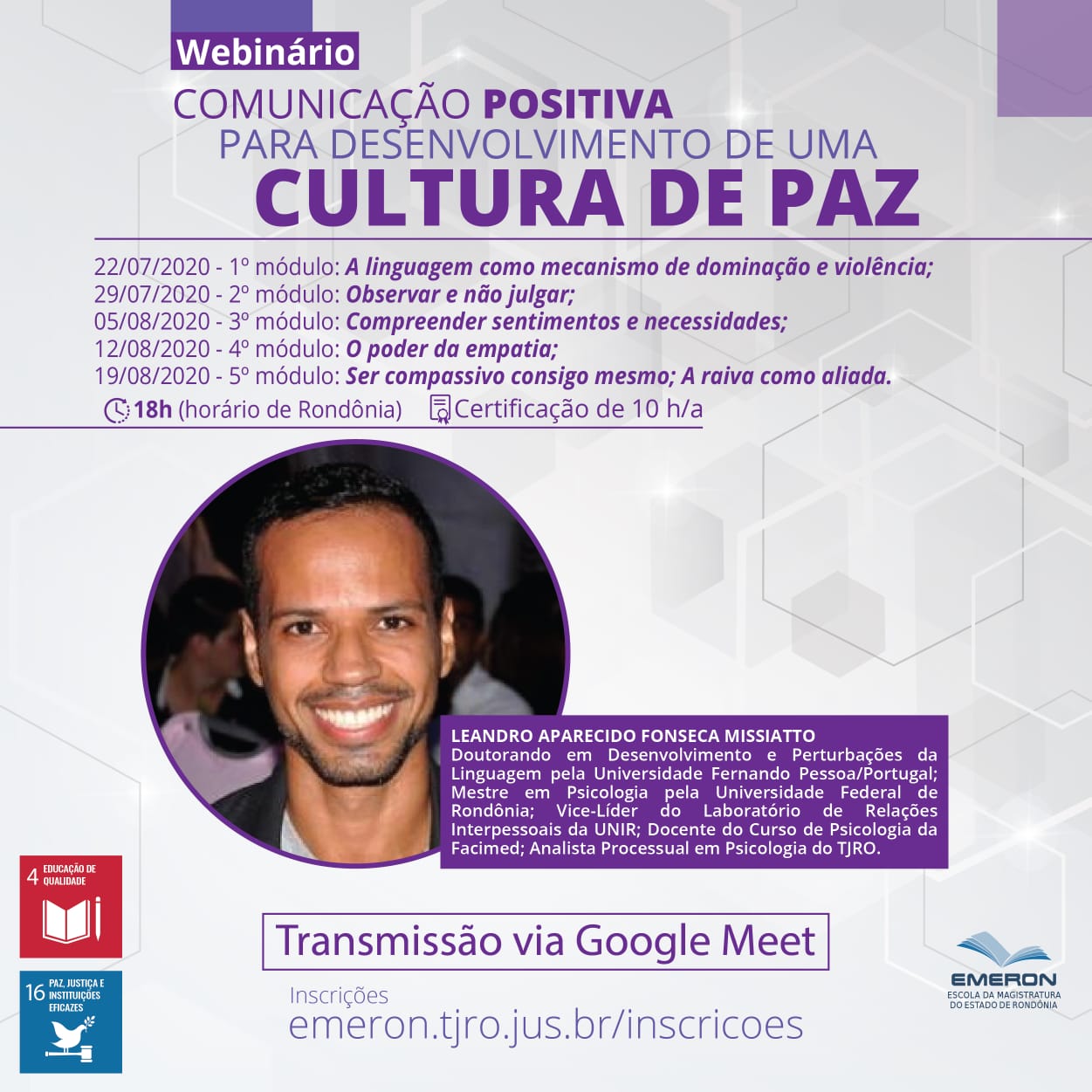 A partir do próximo dia 22, às 18h, a Escola da Magistratura do Estado de Rondônia (Emeron) realizará o webinário Comunicação Positiva para Desenvolvimento de uma Cultura de Paz, ministrado pelo psicólogo do Tribunal de Justiça de Rondônia Leandro Fonseca Missiatto. Dividida em cinco encontros semanais de 2h de duração, sempre às quartas-feiras, a formação ocorrerá via plataforma Google Meet e terá certificação de 10 horas-aula ao final, por meio de inscrição prévia no site da Escola (emeron.tjro.jus.br/inscricoes).