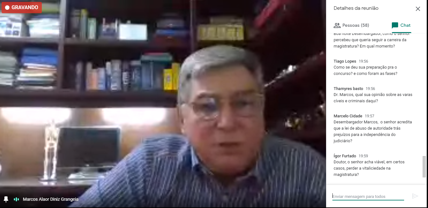 Na quarta-feira, 15, o magistrado do Tribunal de Justiça de Rondônia, ex-diretor da Emeron e atual presidente do Tribunal Regional Eleitoral do estado, desembargador Marcos Alaor Diniz Grangeia, ministrou a palestra “Magistratura: desafios e vocação”. Realizada pela plataforma Google Meet, a atividade foi voltada aos alunos e egressos da Especialização em Direito para a Carreira da Magistratura (EDCM), pós-graduação oferecida pela Emeron, universitários e demais interessados.