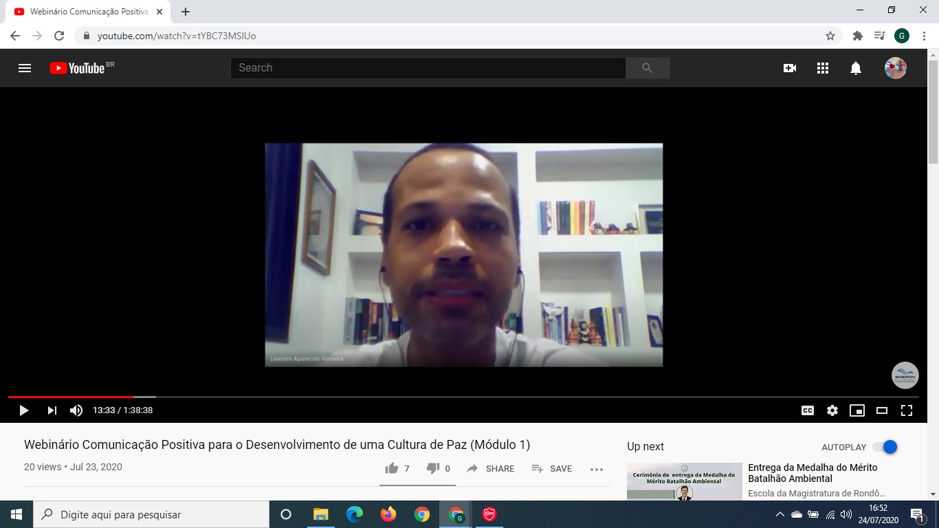 Na quarta-feira (22) à noite, a Escola da Magistratura do Estado de Rondônia (Emeron) deu início ao webinário Comunicação Positiva para Desenvolvimento de uma Cultura de Paz, ministrado pelo psicólogo do Tribunal de Justiça de Rondônia Leandro Fonseca Missiatto. Com transmissões ao vivo pela plataforma Google Meet, os encontros continuam semanalmente ao longo do próximo mês, sempre às quartas, das 18h às 20h (hora de RO). As inscrições (para certificação) são gratuitas e seguem abertas, por meio do menu Inscrições no site da Escola (emeron.tjro.jus.br/inscricoes).