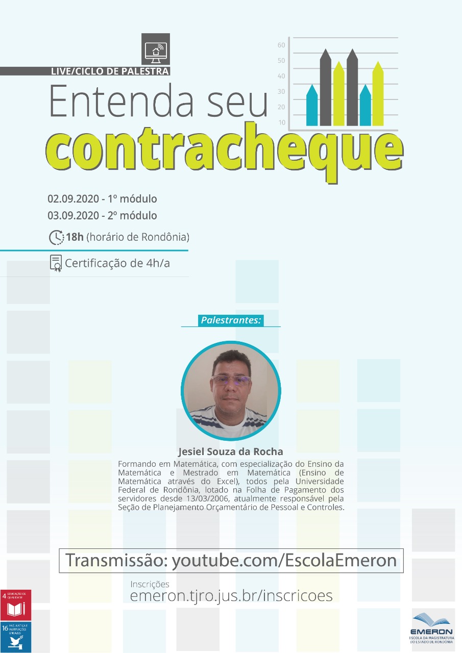Nos próximos dias 2 e 3 de setembro, às 18h (hora de RO), a Escola da Magistratura do Estado de Rondônia (Emeron) realiza o ciclo de palestra Entenda seu Contracheque, com transmissão ao vivo pelo canal da Emeron no YouTube. Destinada a profissionais do Poder Judiciário, a ação educacional será dividida em dois encontros de duas horas cada, com certificação total de 4 horas-aula para os participantes. As inscrições já estão abertas, por meio de formulário disponível no menu Inscrições do site da Escola (emeron.tjro.jus.br).