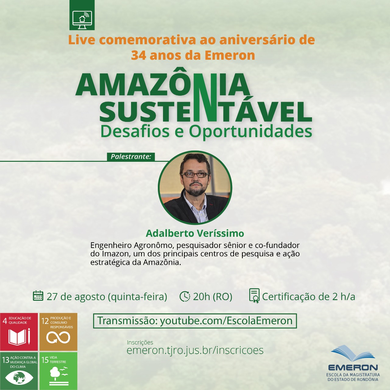 Todas as lives realizadas pela Emeron ficam disponíveis permanentemente no canal do YouTube (youtube.com/EscolaEmeron). A próxima, nesta quinta-feira (27), às 20h (hora de Rondônia), aberta ao público geral, será comemorativa aos 34 anos da Escola, completados nesta última semana. Intitulada “Amazônia Sustentável: Desafios e oportunidades”, a palestra será ministrada pelo conhecido pesquisador Adalberto Veríssimo, cofundador do Imazon, um dos principais centros de pesquisa e ação estratégica da Amazônia. As inscrições estão abertas pelo formulário no menu Inscrições do site da Escola (emeron.tjro.jus.br), com certificação de 2 horas-aula.