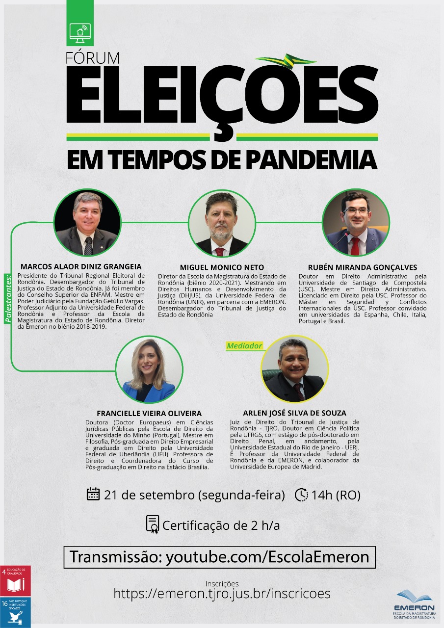 A Escola da Magistratura do Estado de Rondônia (Emeron) promove, no dia 21 de setembro, às 14h (hora de Rondônia), o fórum “Eleições em tempos de pandemia”, ministrado em formato de live por magistrados do Tribunal de Justiça de Rondônia e convidados, com transmissão no canal da Emeron no YouTube. O evento virtual é aberto ao público em geral, com certificação de 2 horas-aula para os participantes, e já está com as inscrições abertas, por meio de formulário no menu Inscrições do site da Escola (emeron.tjro.jus.br).