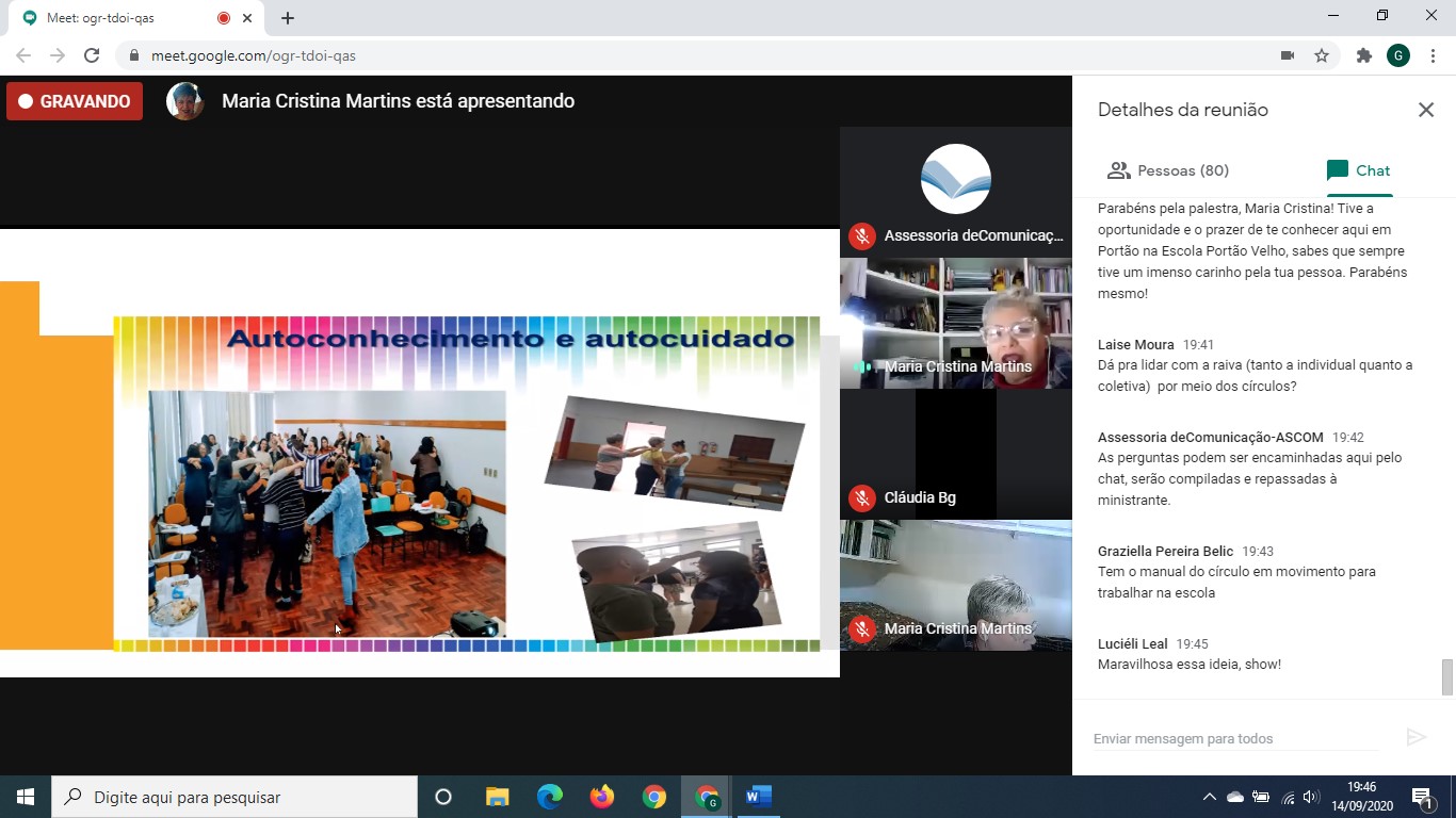 Com atuação ainda como orientadora educacional, psicopedagoga, mediadora civil, supervisora e coordenadora pedagógica, Maria Cristina conduziu, ao longo da palestra, diferentes dinâmicas com os participantes da live, trabalhando noções como a de pertencimento. “O círculo simboliza os princípios fundamentais de liderança compartilhada: igualdade, conexão e inclusão; proporciona foco, comprometimento e participação de todos em um ambiente seguro e respeitoso”, afirmou. Ao final, a ministrante respondeu aos questionamentos do público.