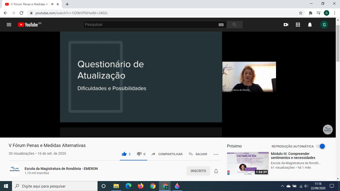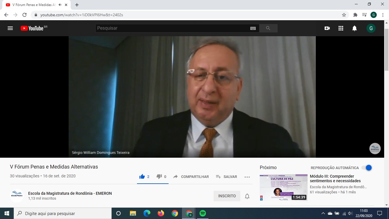 Na última semana, a Escola da Magistratura do Estado de Rondônia (Emeron) realizou mais duas lives, ambas pela plataforma Google Meet. Tanto a palestra “Justiça Restaurativa e Círculos de Construção de Paz – Reflexões e Práticas: As competências socioemocionais no pós-pandemia” como o V Encontro sobre Penas Alternativas, que teve como tema “A responsabilidade social das instituições parceiras em articulação com as políticas públicas em meio à pandemia”, já estão disponíveis para visualização no canal da Emeron no YouTube (youtube.com/EscolaEmeron).