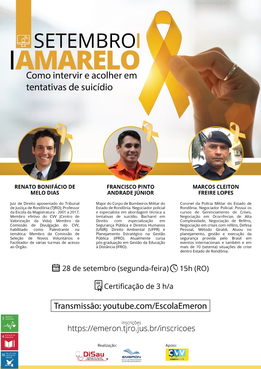 Na próxima segunda-feira, dia 28, às 15h (hora de RO), a Escola da Magistratura de Rondônia (Emeron) promoverá a live “Setembro Amarelo: Como intervir e acolher em tentativas de suicídio”, em seu canal no YouTube (youtube.com/EscolaEmeron). Realizada pela Divisão de Saúde e Bem-Estar Organizacional (Disau) do Tribunal de Justiça do Estado com participação do Centro de Valorização da Vida (CVV), a ação é aberta ao público em geral, em especial aos servidores e magistrados do Poder Judiciário rondoniense, e oferece certificação de 3 horas-aula aos participantes. As inscrições já estão abertas, no menu Inscrições do site da Emeron (emeron.tjro.jus.br).