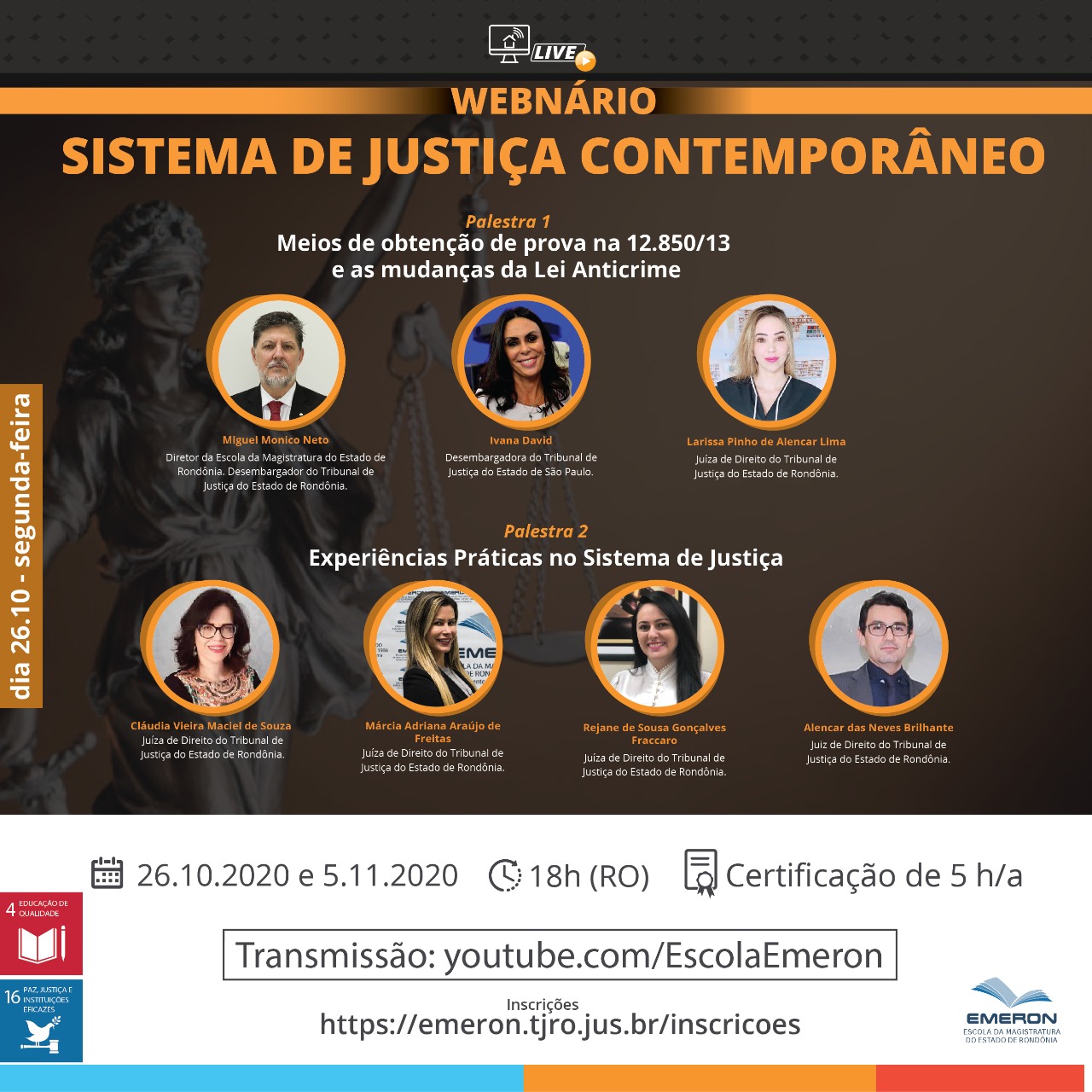 O Núcleo Pedagógico (Nuped-Jipa) da Escola da Magistratura do Estado de Rondônia (Emeron) em Ji-Paraná promoverá nos dias 26 de outubro e 5 de novembro, às 18h, o Webinário Sistema de Justiça Contemporâneo, transmitido ao vivo pelo Canal da Escola no Youtube. Coordenado pela juíza Larissa Pinho de Alencar Lima, que também coordena o Nuped, o evento visa oportunizar aos alunos da Especialização em Direito para a Carreira da Magistratura (EDCM) na Comarca, e aos profissionais do direito um espaço para a reflexão e o conhecimento sobre a multidisciplinaridade que envolve a justiça nos dias atuais.
