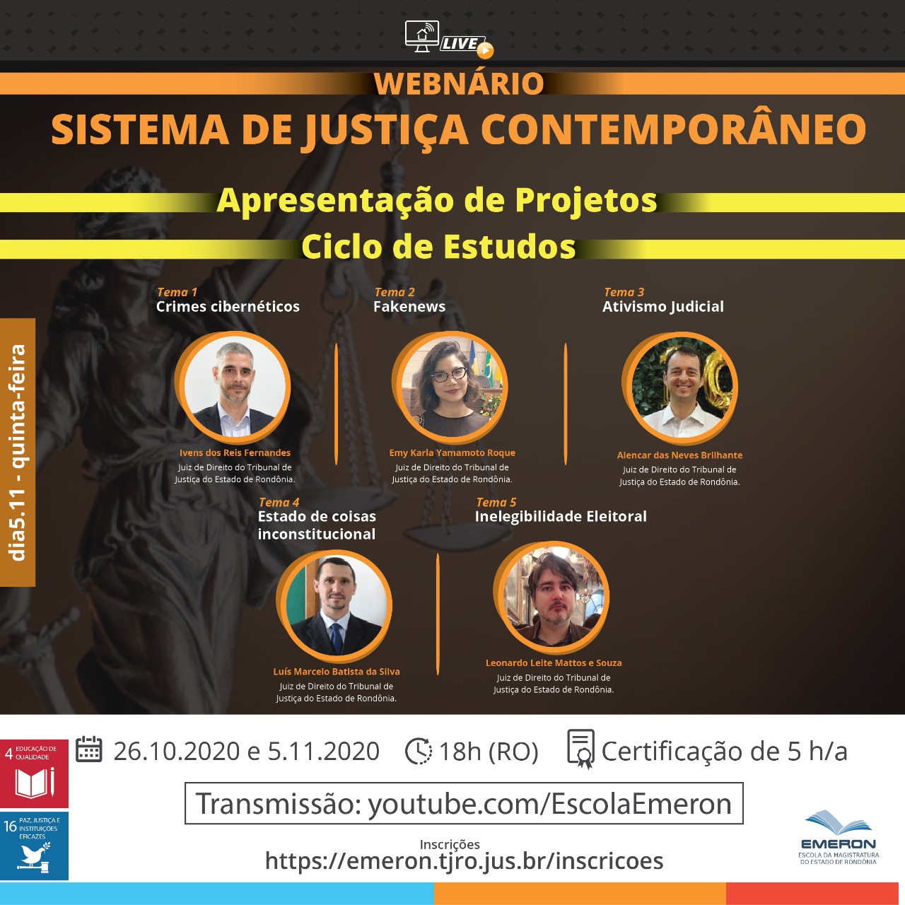 Já no dia 5 de novembro, o evento apresenta um ciclo de estudos com temáticas afins à justiça contemporânea. Crimes cibernéticos, Fakenews, Ativismo Judicial, Estado de Coisas Inconstitucional e Inelegibilidade Eleitoral serão os temas abordados pelos juízes do TJRO e professores do EDCM Ivens dos Reis Fernandes, Emy Karla Yamamoto Roque, Wanderley José Cardoso, Luís Marcelo Batista da Silva e Leonardo Leite Mattos e Souza, respectivamente. Neste dia também serão apresentados projetos de pesquisa desenvolvidos no Nuped-Jipa.
