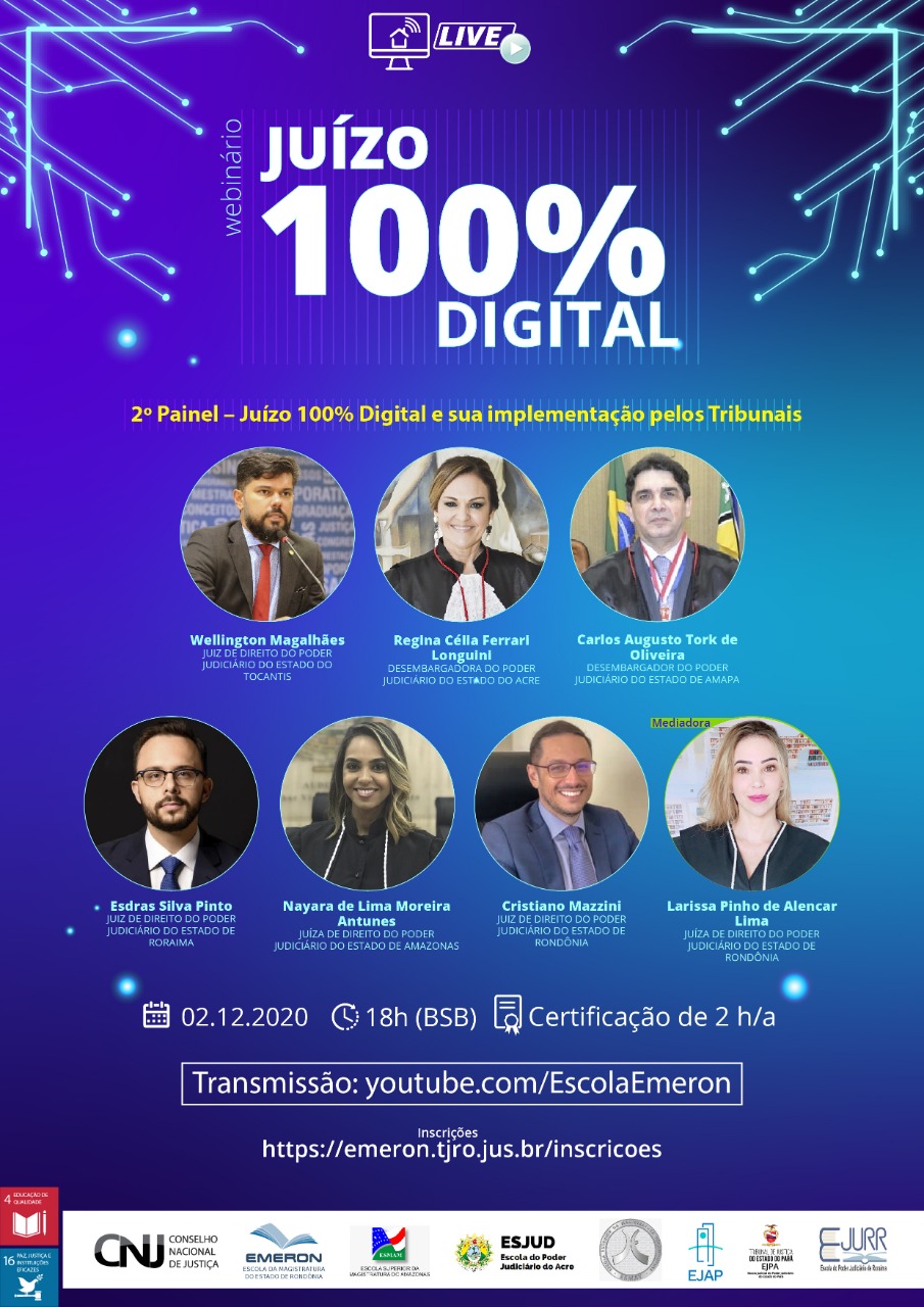Nesta quarta-feira, 2, a partir das 17h (hora de RO), o webinário Juízo 100% Digital, no canal da Emeron no YouTube (youtube.com/EscolaEmeron), será aberto ao público geral, com certificação de 2 horas-aula. A live reunirá magistrados de tribunais e Escolas Judiciais de toda a Região Norte, além de juízes representantes do Conselho Nacional de Justiça (CNJ), em dois painéis de discussões consecutivos. As inscrições já estão disponíveis, pelo menu Inscrições do site da Escola (emeron.tjro.jus.br).