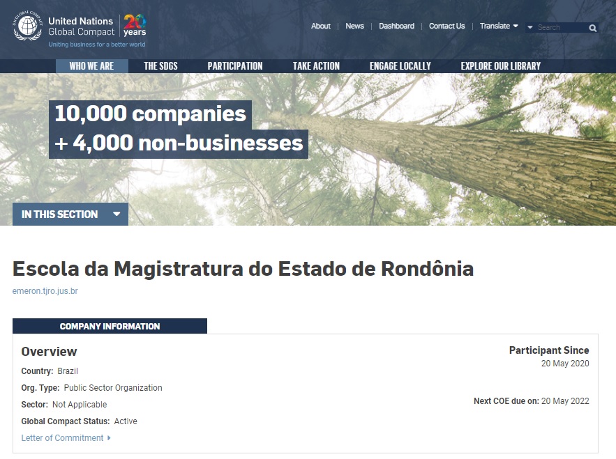 A entrada no Pacto Global, maior iniciativa global de sustentabilidade e que conta com mais de 13 mil membros em 166 países, evidencia o caráter vanguardista da Emeron, visto que é a primeira Escola Judicial do país a fazê-lo, e também seu papel social e comprometimento enquanto Escola de Governo e instituição de ensino superior, ao alinhar sua estratégia à políticas internacionais de desenvolvimento social e humano. Como signatária, a Emeron passa a integrar em seus objetivos institucionais, pesquisas acadêmicas e formações/capacitações temas vinculados à sustentabilidade e direitos humanos, além de assumir o compromisso de promover ações afirmativas de impacto social e posicionar-se como divulgadora dos Objetivos de Desenvolvimento Sustentável (ODS).