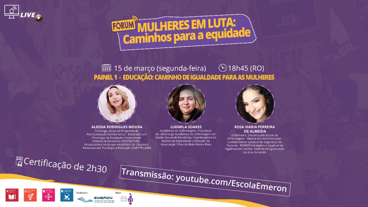 Em alusão ao Dia Internacional da Mulher (8 de março), data instituída pela Organização das Nações Unidas (ONU) e ao Dia da Escola (15), a Escola da Magistratura do Estado de Rondônia (Emeron) promoverá hoje, a Aula Magna da Especialização em Direito para a Carreira da Magistratura (EDCM) com o tema Educação: caminho de igualdade para as mulheres. O painel faz parte do Fórum Mulheres em Luta: Caminhos para a equidade, que também terá atividades no dia 22 deste mês.