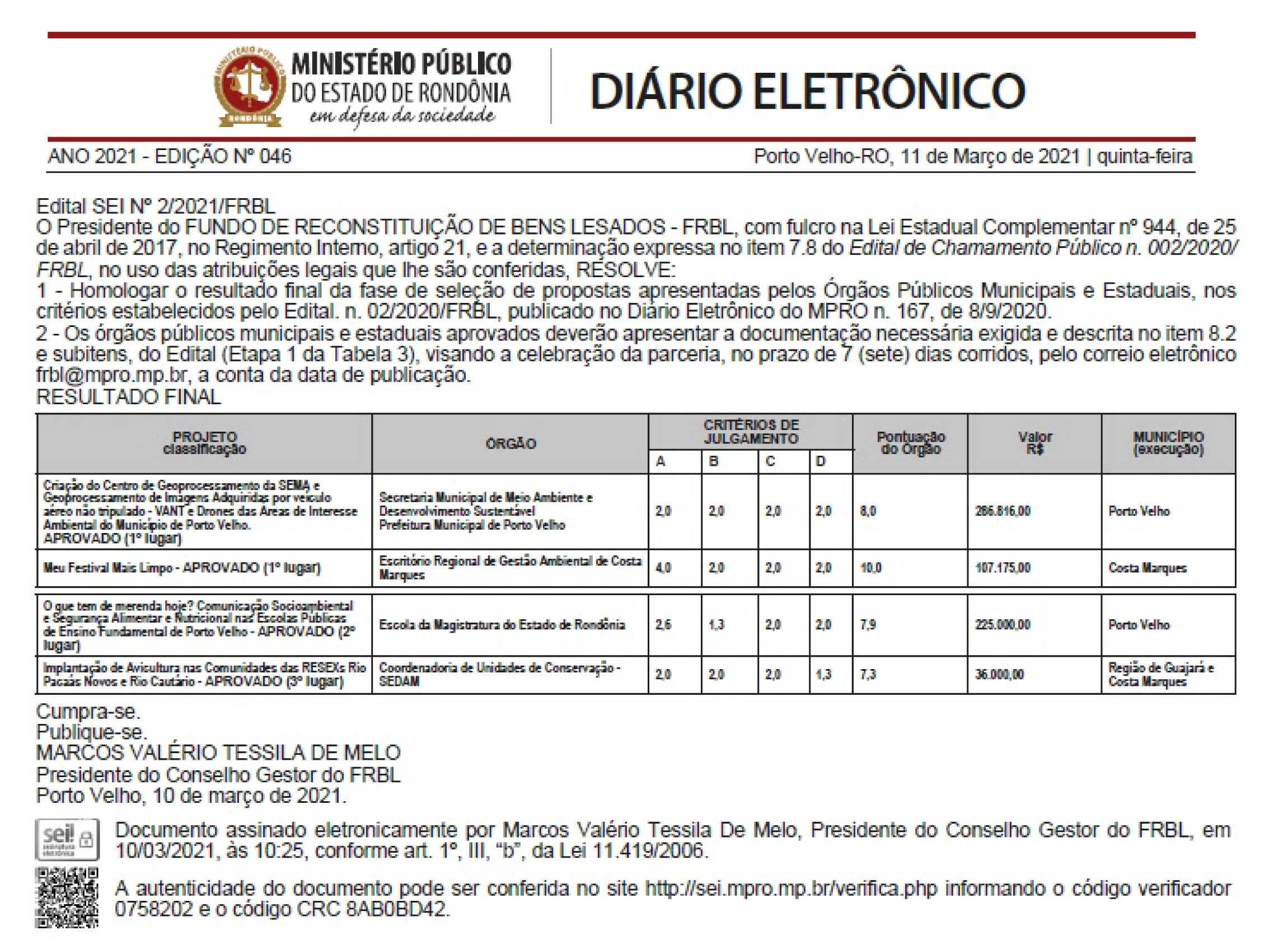 O resultado foi homologado no último dia 11 de março com a publicação do resultado final do Diário Eletrônico do Ministério Público. Agora, o chamamento entra na fase de celebração, para a apresentação da documentação exigida em edital e assinatura do Termo de Fomento. Após a formalização do termo os projetos serão comunicados ao Grupo de Atuação Especial de Defesa do Meio Ambiente, do MPRO, para monitoramento e acompanhamento pertinentes.