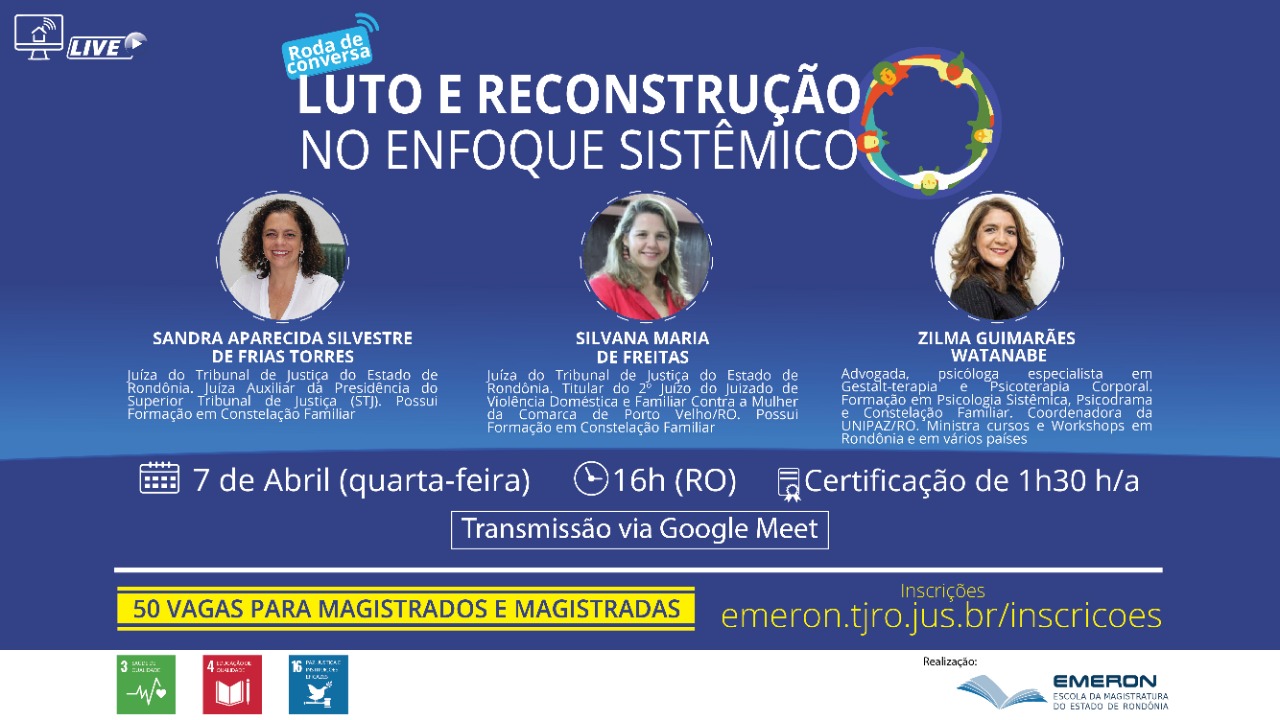 Nesta quarta-feira (7), das 16h às 18h (hora de RO), a Escola da Magistratura do Estado de Rondônia (Emeron) realizará a Roda de Conversa virtual “Luto e reconstrução no enfoque sistêmico”. Com certificação de 2 horas-aula (mediante inscrição prévia), o evento é gratuito e voltado a magistrados e magistradas do Poder Judiciário de Rondônia.