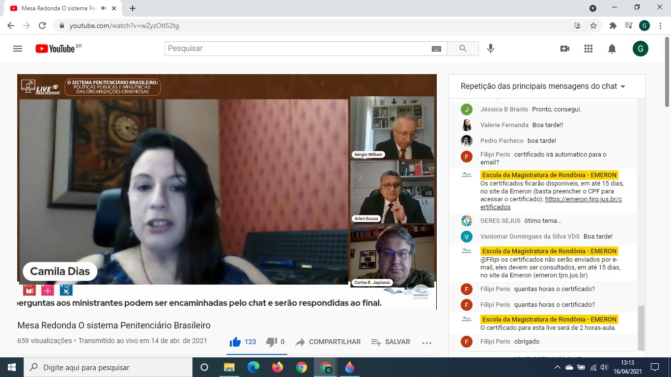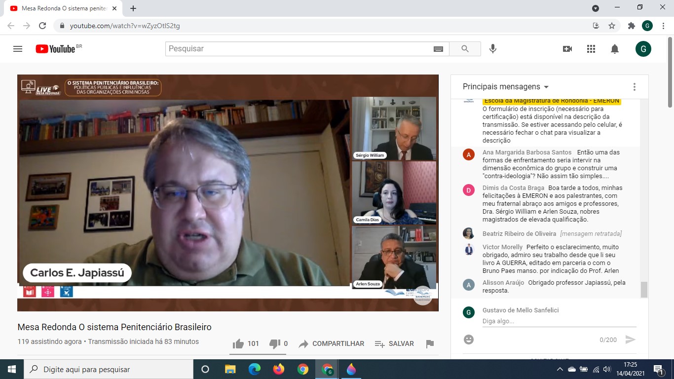 Na tarde da última quarta-feira (14), a Escola da Magistratura do Estado de Rondônia (Emeron) promoveu, em seu canal no YouTube (youtube.com/EscolaEmeron), a mesa redonda O Sistema Penitenciário Brasileiro: Políticas públicas e influências das organizações criminosas. Participaram como debatedores os professores doutores Carlos Eduardo Japiassú e Camila Caldeira Dias.