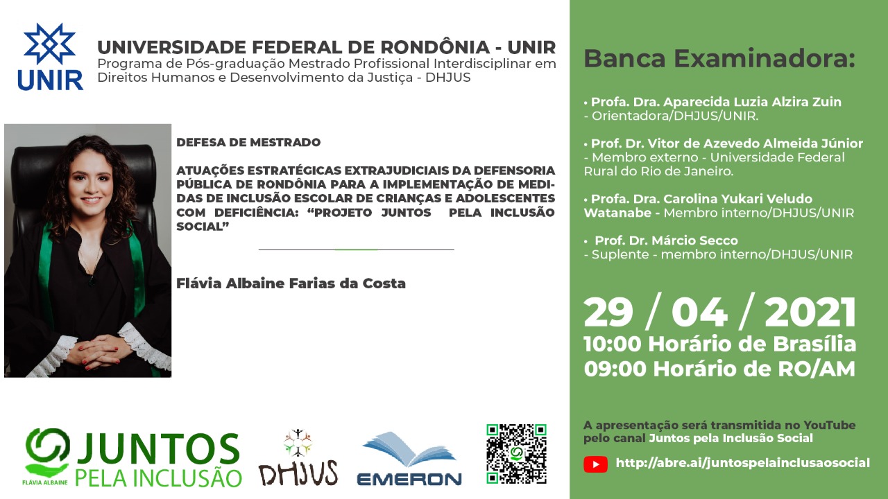 A próxima defesa prevista pelo DHJUS, marcada para o próximo dia 29 de abril, às 9h, será da defensora pública estadual Flávia Albaine Farias, com transmissão pelo YouTube do canal Juntos pela Inclusão Social, projeto que é tema de seu trabalho, orientado pela professora Aparecida Zuin.