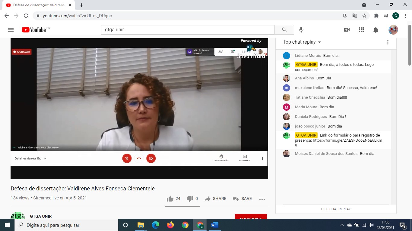 Por fim, no dia 29, a procuradora da República Gisele Bleggi Cunha, titular do 6º Ofício da Procuradoria da República em Rondônia, defendeu sua dissertação “UHE Tabajara: Falhas no EIA/RIMA e Violações aos Direitos Humanos das Populações Locais”, em que pesquisou, orientada pelo professor Ricardo Gilson, o caso do projeto da usina hidrelétrica Tabajara, em Machadinho d’Oeste, e o processo de licenciamento ambiental (EIA/RIMA) do empreendimento, que segundo ela revelou sérias incongruências e desrespeito ao ordenamento jurídico ambiental. A banca de avaliação da procuradora, assim como a da magistrada Valdirene Clementele, foi transmitida pelo canal do grupo de pesquisa em Gestão do Território e Geografia Agrária da Amazônia (GTGA) no YouTube, onde estão disponíveis para visualização.