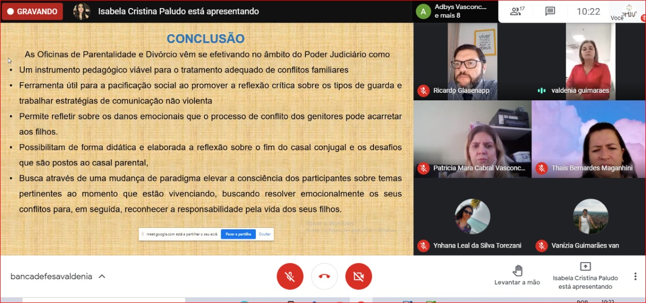 Na quarta-feira (14), a assistente social Valdênia Guimarães, chefe da Seção de Atendimento Psicossocial no TJRO, defendeu sua dissertação intitulada “Análise da Eficácia das Oficinas de Parentalidade e Divórcio nas Varas de Família de Porto Velho”. Orientada pela professora doutora Thais Maganhini, a servidora abordou o programa educacional interdisciplinar das Oficinas de Parentalidade, direcionado às famílias que enfrentam conflitos relacionados ao exercício da parentalidade dissociada da conjugalidade, com o intuito de pacificar relações e auxiliar o casal em vias de separação a criar uma efetiva e saudável relação parental junto aos filhos ou filhas. “A pesquisa tem como foco investigar a execução das Oficinas nas Varas de Família e averiguar se a participação das partes permite um maior número de acordos no âmbito da Conciliação e da Mediação”, diz Valdênia.