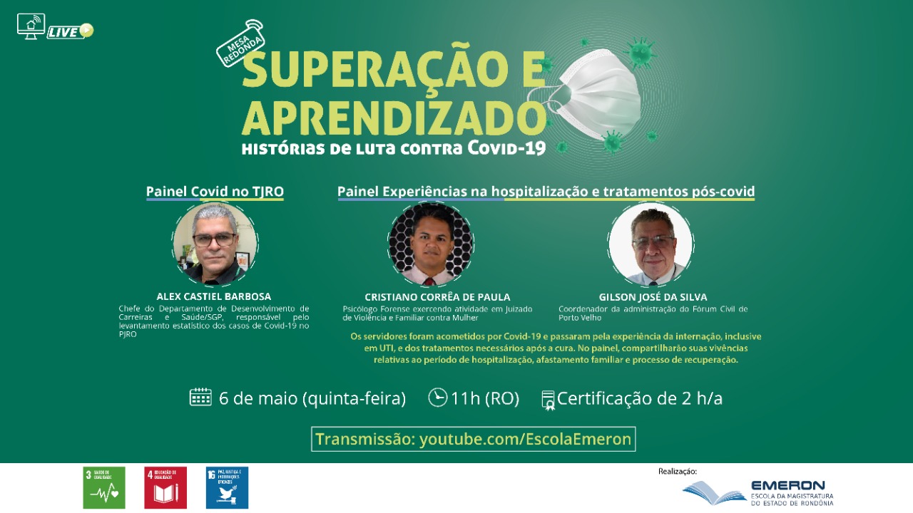 A Escola da Magistratura do Estado de Rondônia (Emeron) realizará, na próxima quinta-feira (6/5) a Mesa Redonda Superação e aprendizado: histórias de luta contra Covid-19. A live será realizada às 11h (RO) e transmitida ao vivo pelo Canal da Emeron no Youtube.