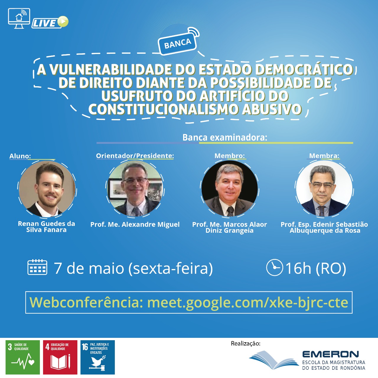 A turma Porto Velho da Especialização em Direito para a Carreira da Magistratura da Escola da Magistratura do Estado de Rondônia (Emeron) realizará nos próximos dias duas bancas de apresentação de trabalho de conclusão de curso. As bancas serão transmitidas pelo Google Meet e pelo Youtube nesta sexta-feira (7) e na segunda-feira (10).