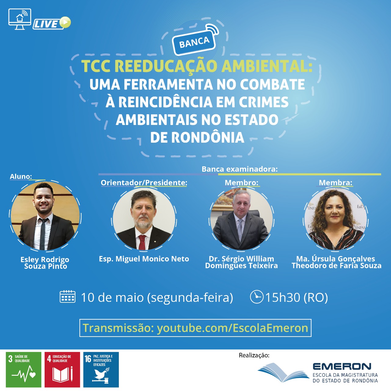 Já no dia 10, a monografia “Uma Ferramenta no Combate à Reincidência em Crimes Ambientais no Estado de Rondônia”, do discente Esley Rodrigo Souza Pinto, será avaliada pelos professores especialista Miguel Monico Neto, orientador do trabalho, mestre Úrsula Gonçalves Theodoro de Faria Souza e doutor Sérgio William Domingues Teixeira. A banca será transmitida ao vivo, às 15h30 pelo Youtube da Emeron (youtube.com/EscolaEmeron).
