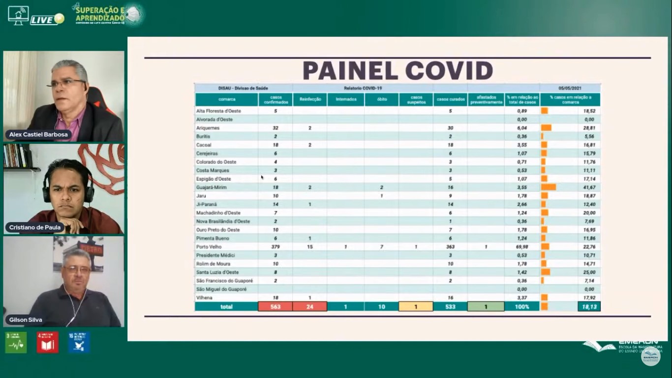 Na última quinta-feira (6), a Escola da Magistratura de Rondônia (Emeron) promoveu em seu canal no YouTube a live “Superação e Aprendizado: Histórias de luta contra Covid-19”, com a participação de três servidores do Tribunal de Justiça do Estado. Em formato de mesa redonda, foram abordados os “Dados da Covid no TJRO” e as “Experiências na hospitalização e tratamentos pós-Covid”.