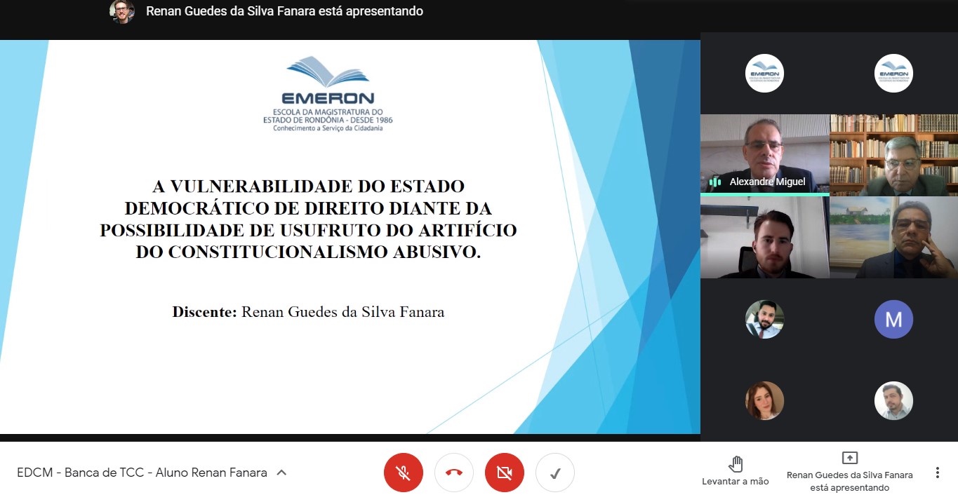 Também da EDCM, a banca avaliadora do aluno Renan Fanara, que é técnico judiciário lotado na Central de Processos Eletrônicos (CPE) do 1º Grau, aconteceu na última sexta-feira, dia 7. Sob orientação do professor Alexandre Miguel, a monografia intitulada “A Vulnerabilidade do Estado Democrático de Direito diante da Possibilidade de Usufruto do Artifício do Constitucionalismo Abusivo” apresenta o denominado constitucionalismo abusivo. “Nada mais é do que um mecanismo utilizado por alguns governantes com o fim de combalir a ordem democrática por meio da elaboração ou reforma da Constituição existente, sendo que nas últimas décadas países identificados como democráticos têm se utilizado desse artifício”, diz Renan. “O trabalho propõe algumas medidas de contenção, que poderiam dar fôlego e fortalecer a democracia, em lugares onde ela é constantemente vulnerada”, complementa o servidor.