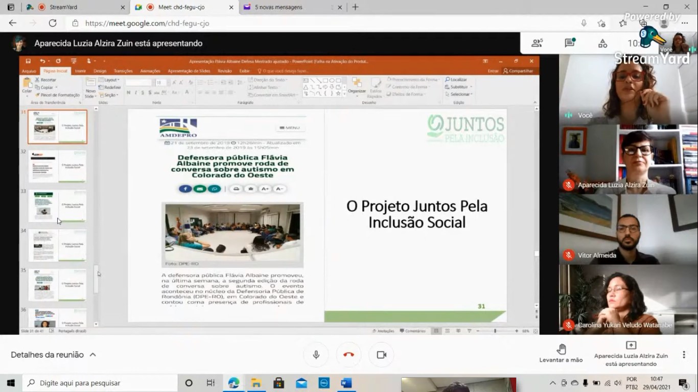 Por fim, o programa de mestrado teve duas defesas de dissertação de alunos da terceira turma, com entrada em 2019. A primeira, no dia 29 de abril, foi da defensora pública estadual Flávia Albaine Farias, transmitida pelo YouTube do canal Juntos pela Inclusão Social (onde está disponível para visualização), projeto que é tema de seu trabalho. Orientada pela professora Aparecida Zuin e intitulada “Atuações Estratégicas Extrajudiciais da Defensoria Pública de Rondônia para a Implementação de Medidas de Inclusão Escolar de Crianças e Adolescentes com Deficiência”, a pesquisa objetiva trazer reflexões sobre a atuação extrajudicial da Defensoria Pública do Estado (DPE) para auxiliar na efetivação da educação inclusiva de crianças e adolescentes com deficiência na comarca de Colorado do Oeste. “O trabalho se justifica diante da importância que o direito à educação exerce para a conquista da autonomia e da dignidade de um grupo de pessoas marcado por um histórico de exclusão e preconceito”, ressalta Flávia, que entrevistou profissionais da educação e visitou sete escolas públicas da região.