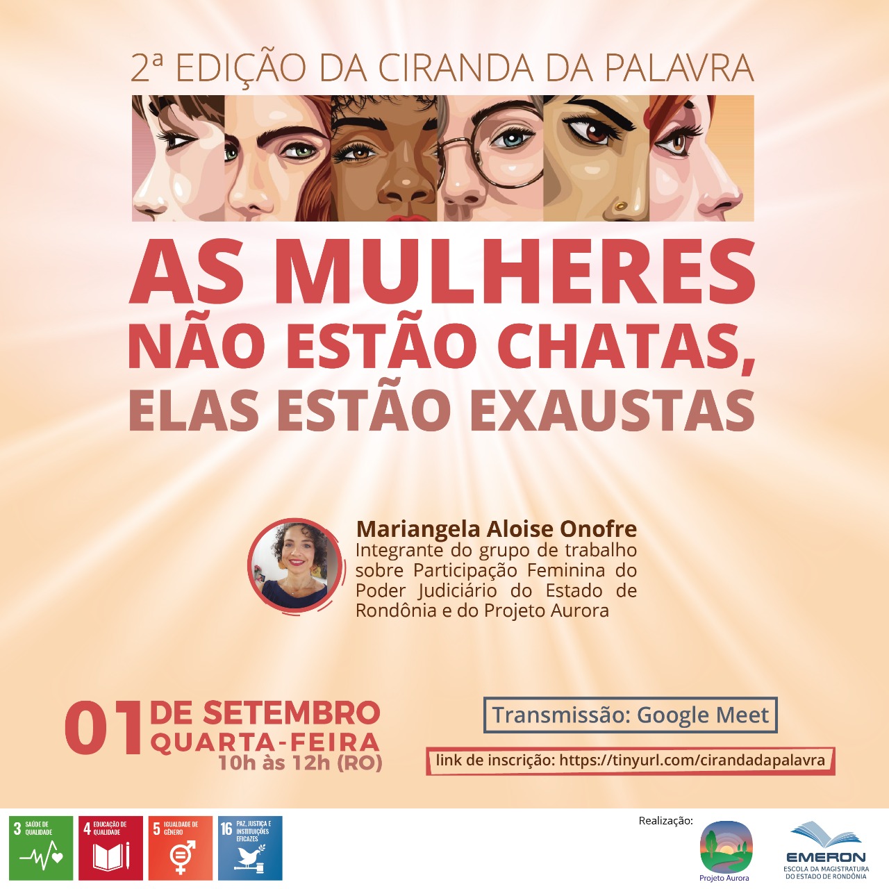 “As mulheres não estão chatas, elas estão exaustas”: com essa afirmação, que dá nome à 2ª Ciranda da Palavra, psicólogas do Tribunal de Justiça de Rondônia conduzirão uma roda de conversa entre servidoras e magistradas. A proposta é oferecer um acolhimento às mulheres, para que possam compartilhar suas experiências à frente do cuidado com a casa e filhos, aliado ao trabalho. Será mais uma roda de conversa do Projeto Aurora, que se realizará por meio da plataforma Google Meet, no dia 1º de setembro.