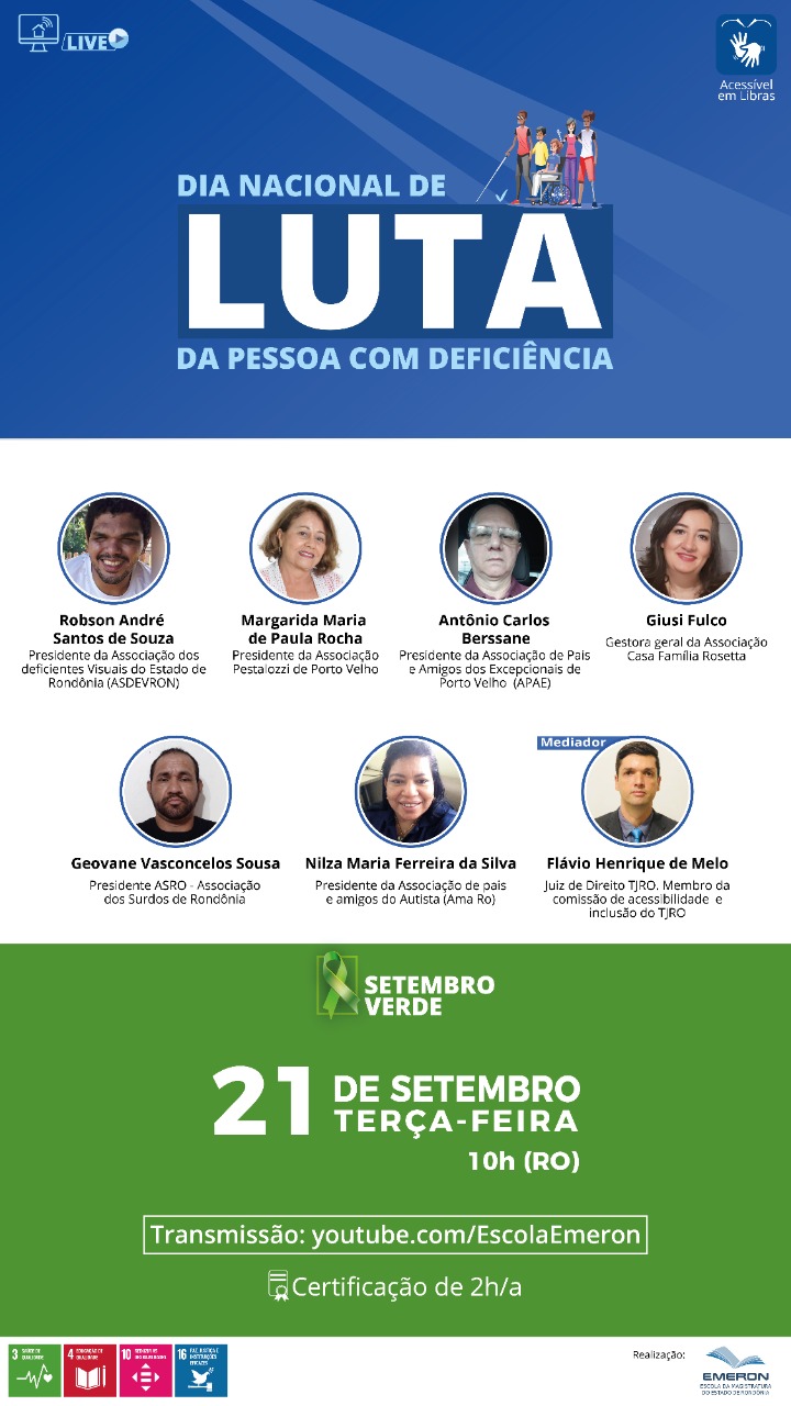 Na próxima terça, 21 de setembro, a Escola da Magistratura do Estado de Rondônia - Emeron e a Divisão de Saúde e a Comissão Permanente de Acessibilidade do Tribunal de Justiça de Rondônia - TJRO, promovem no canal da Emeron no YouTube (youtube.com/EscolaEmeron), o Fórum Dia Nacional de Luta da Pessoa com Deficiência. A live, que será realizada às 10h (RO), é aberta ao público geral e terá certificação de 2 horas-aula, com inscrições realizadas durante a transmissão.