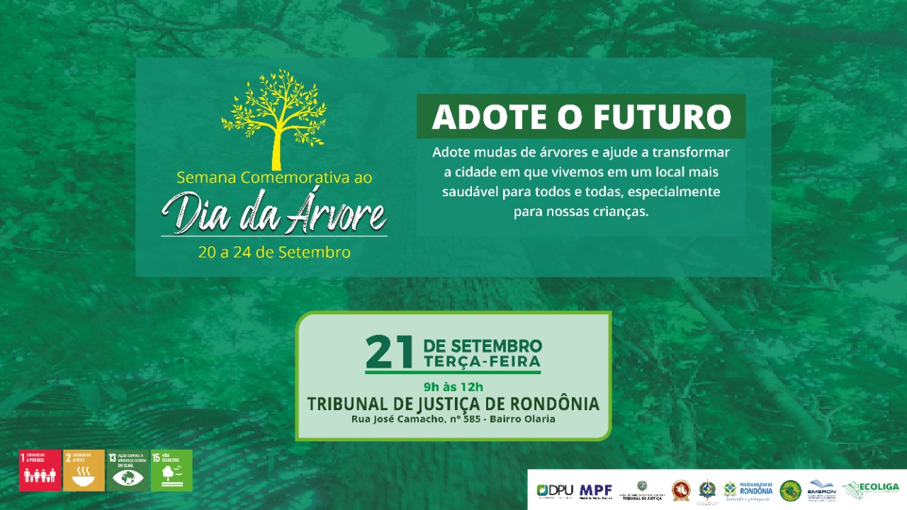 A Escola da Magistratura do Estado de Rondônia (Emeron), a Polícia Militar de Rondônia (PMRO) por meio do Batalhão de Polícia Ambiental (BPA) e a Egoliga-Rondônia, promovem, pelo segundo ano consecutivo, a campanha Adote o Futuro, que visa a adoção de árvores para o confronto ao desmatamento na Amazônia. Este ano, a ação será realizada de 20 a 24 de setembro nas sedes dos órgãos participantes da Ecoliga, em Porto Velho.