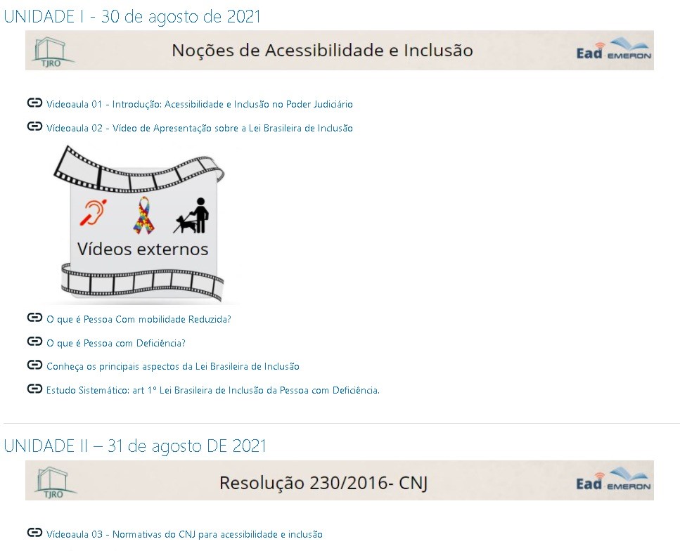 Desenvolvido pelo servidor Alexandro Almeida, do Núcleo de Acessibilidade, Inclusão e Gestão Socioambiental (Nages), o curso objetiva aperfeiçoar o público interno sobre a importância dos valores de acessibilidade e inclusão, de acordo com as orientações do Conselho Nacional de Justiça e do próprio PJRO, visando ao devido acolhimento e atendimento das pessoas com deficiência. Os conteúdos criados por Alexandro, que também é membro da Comissão Permanente de Acessibilidade e Inclusão (CPAI), abordam, entre outros tópicos: os objetivos e diretrizes da Lei Brasileira de Inclusão; caracterização da deficiência e acessibilidade (conceito em evolução); barreiras e desenho universal, adaptação razoável, tecnologia assistiva; discriminação por motivos de deficiência (atrelada à Política de Prevenção e Combate ao Assédio Moral, Sexual e Discriminação); disposições relacionadas a servidores(as) com deficiência ou que tenham cônjuge, filho ou dependente com deficiência; condutas tipificadas com penas de advertência; e iniciativas e ações em desenvolvimento.