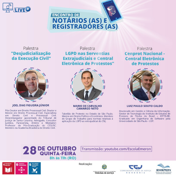 A Corregedoria-Geral da Justiça de Rondônia, por intermédio da Escola da Magistratura do Estado (Emeron), realizará a segunda parte do Encontro de Notários(as) e Registradores(as) nesta quinta (28), das 8h às 11h (RO). O evento terá três palestras sobre a área do extrajudicial e poderá ser acompanhado ao vivo pelo canal do YouTube da Emeron (youtube.com/EscolaEmeron).