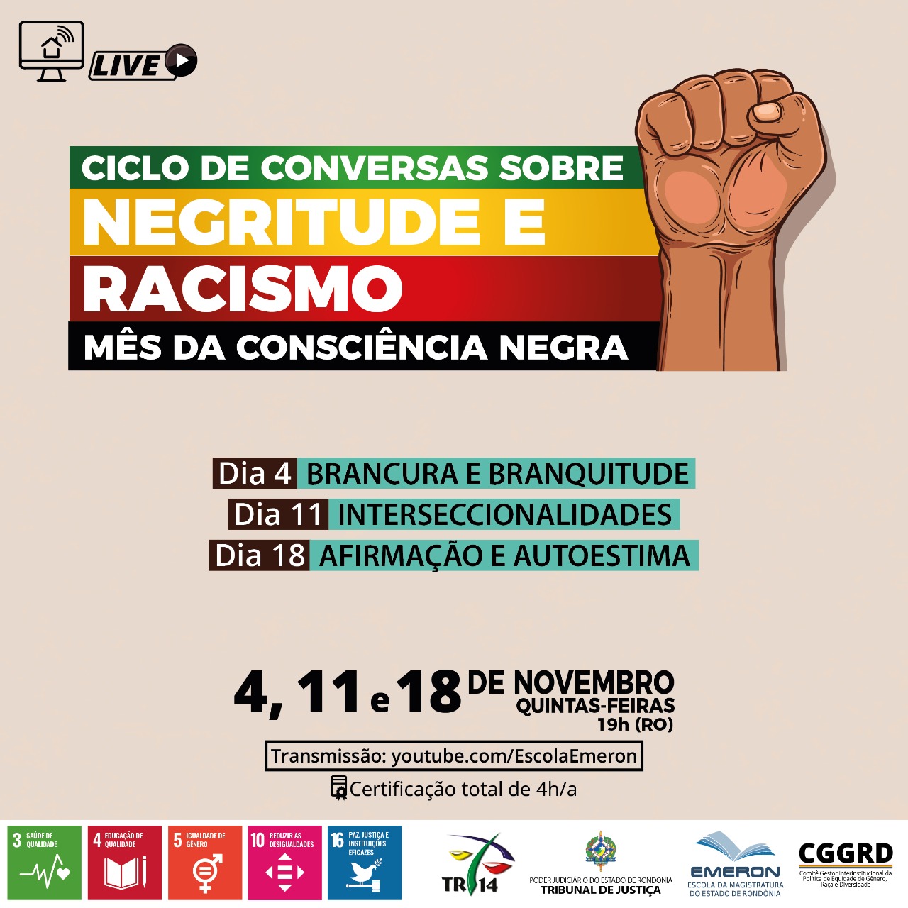 O Ciclo de Conversas sobre Negritude e Racismo atende ainda a cinco dos 17 Objetivos de Desenvolvimento Sustentável (ODS), propostos pela Organização das Nações Unidas por meio da Agenda 2030 e do Pacto Global, do qual a Emeron é signatária desde maio do ano passado. São eles: 3 – Saúde e Bem-estar; 4 – Educação de Qualidade; 5 – Igualdade de Gênero; 10 – Redução das Desigualdades; e 16 – Paz, Justiça e Instituições Eficazes.