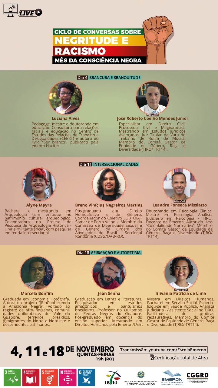 Por fim, a última live será no dia 18, com o tema Afirmação e Autoestima, visando fortalecer as práticas de resistência que afirmam a identidade negra como autoestima, empoderamento e pluralidade humana. A fotógrafa Marcela Bonfim, autora do projeto “(Re)Conhecendo a Amazônia Negra”, voltado ao registro de afro-indígenas, comunidades quilombolas do Vale do Guaporé, terreiros, presídios, (i)migrantes do Norte e Nordeste e descendentes antilhanos, conversará com o pesquisador em estudos amazônicos e bantuísmos brasileiros Jean Senna, professor no Quilombo de Pedras Negras do Guaporé. A mediadora será a facilitadora de práticas restaurativas e assistente social do TJRO Elivânia de Lima, mestra em Direitos Humanos e Desenvolvimento da Justiça (DHJUS) pela Universidade Federal de Rondônia e Emeron, e que também compõe o Comitê Gestor.