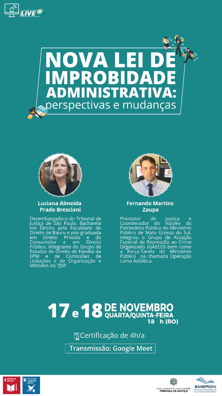 Nos dias 17 e 18 de novembro, às 18h (RO), a Escola da Magistratura do Estado (Emeron) realizará o Seminário Nova lei de improbidade administrativa: perspectivas e mudanças, pelo Google Meet. Com carga horária total de 4h, o evento é voltado ao público interno e externo, com frequência para certificação feitas por meio de link próprio durante a transmissão.