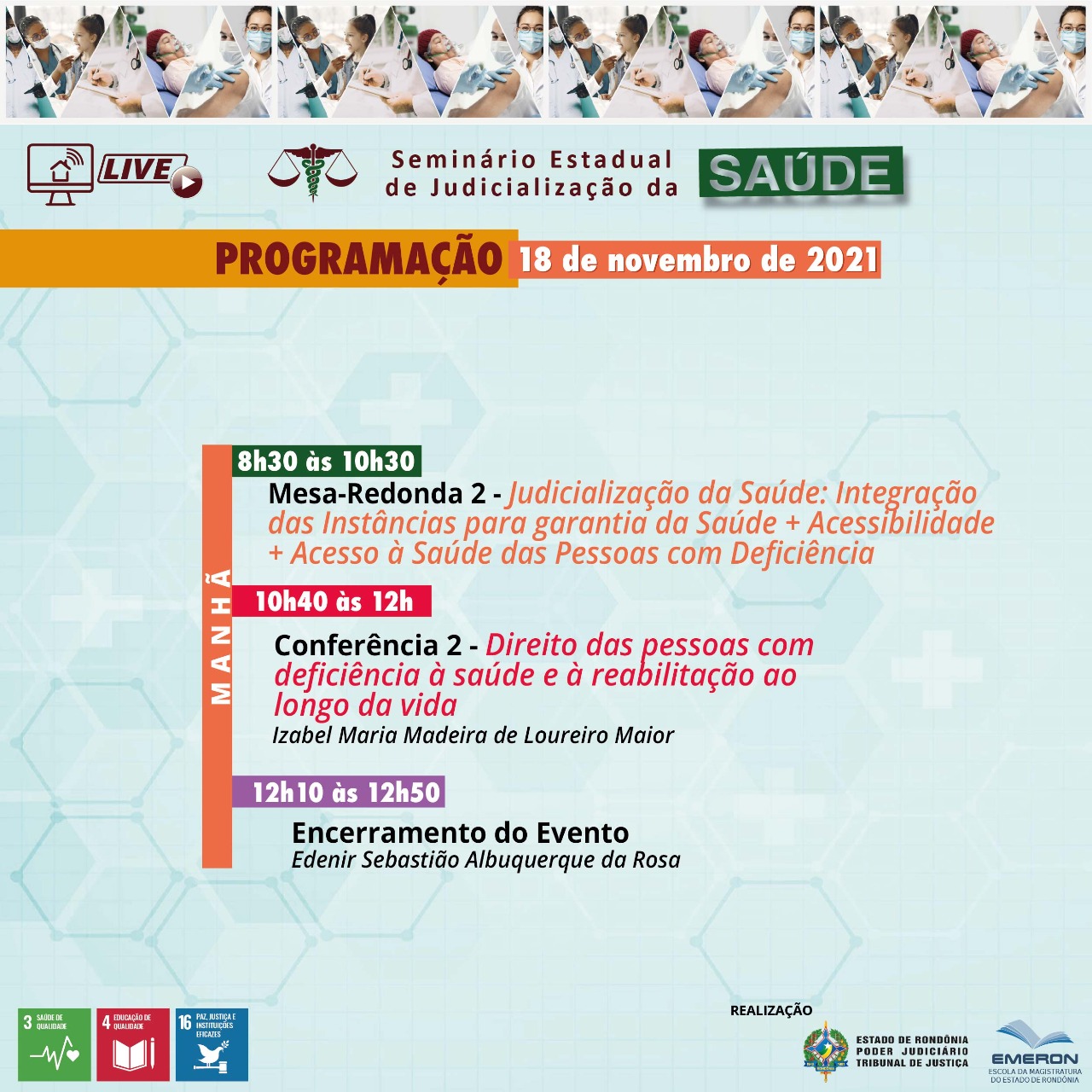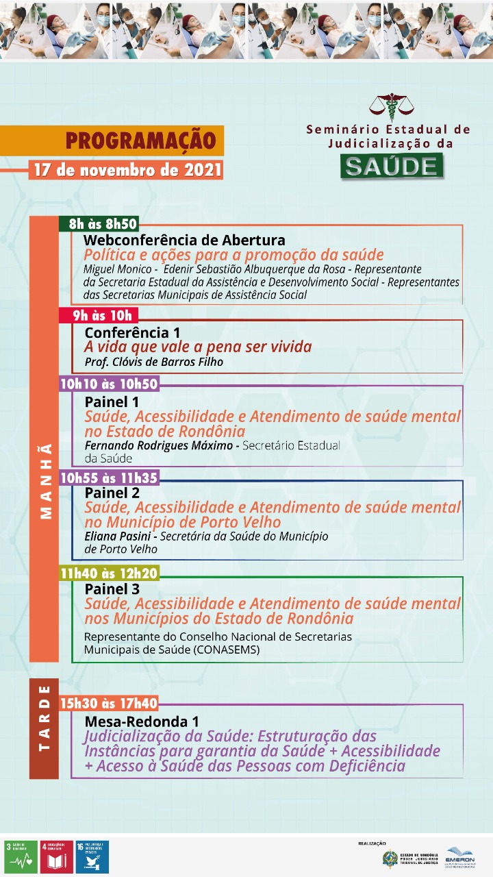 Realizado pela primeira vez em dezembro de 2020, o seminário tem como objetivo que os/as participantes adotem melhorias procedimentais em suas atuações com base no panorama da judicialização da saúde e da política judiciária de saúde no estado de Rondônia e nos seus municípios, e na discussão acerca de que maneira a sociedade, gestão e Poder Judiciário podem efetivar o direito a saúde, acessibilidade e atendimento à saúde mental. Apesar de a saúde ser um dos direitos sociais presentes no rol do artigo 6º da Constituição Federal de 1988, o judiciário torna-se a última alternativa para muitos pacientes, com o fenômeno da judicialização direcionando-se para serviços como o fornecimento de medicamentos, a disponibilização de exames e a cobertura de tratamentos para doenças.