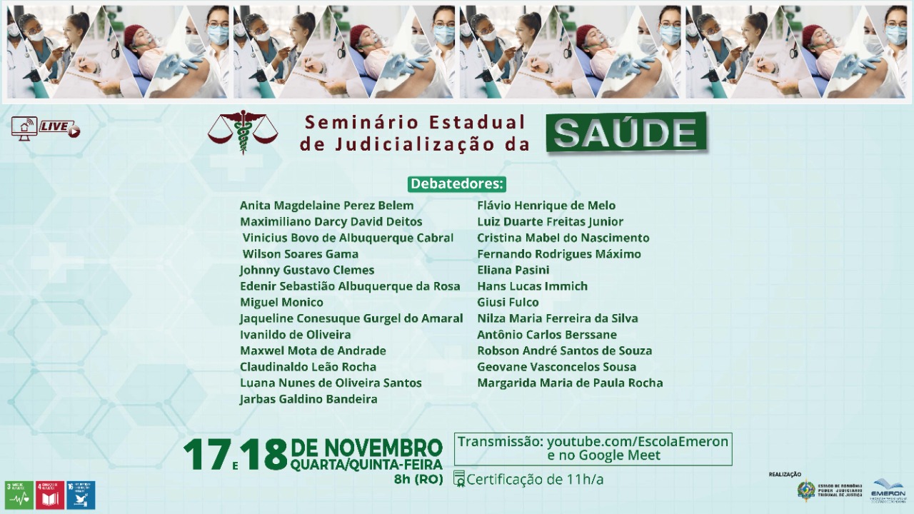 Nos dias 17 e 18 de novembro, a Escola da Magistratura de Rondônia (Emeron) realiza, em seu canal no YouTube (youtube.com/EscolaEmeron) e pelo Google Meet, o II Seminário Estadual de Judicialização da Saúde. Aberto ao público e com carga horária total de 10 horas-aula, o evento acontece das 8h às 12h10 e 15h30 às 17h40, no dia 17, e das 8h30 às 12h10 no dia 18, com inscrições para certificação feitas por meio de link próprio durante a transmissão.