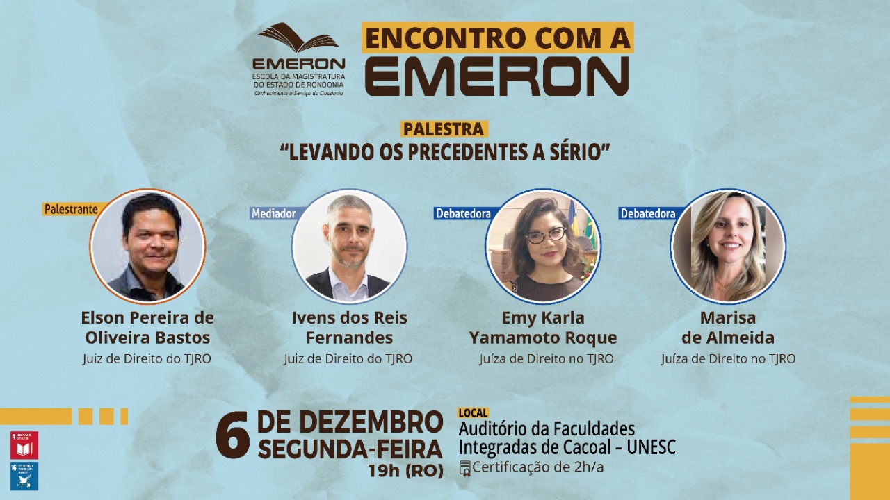 O evento é voltado a alunos e alunas de direito e demais profissionais da área jurídica e é totalmente gratuito, com inscrições realizadas no local e certificação de 2 h/a. Na programação, o Juiz de Direito Elson Bastos ministrará a palestra "Levando os precedentes a sério", com mediação do também juiz Ivens Fernandes e participação das juízas Emy Roque e Marisa de Almeida como debatedoras, todos docentes do EDCM. O Encontro com a Emeron também contará com a apresentação da Especialização em Direito para a Carreira da Magistratura – EDCM, por meio de vídeo institucional e tira dúvidas aos presentes.