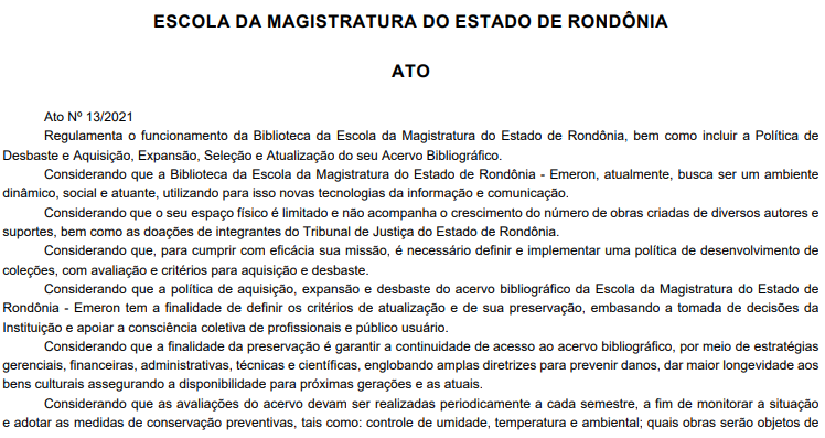 A Escola da Magistratura do Estado de Rondônia (Emeron) publicou, no Diário da Justiça de hoje (7), o Ato n° 13/2021, que regulamenta o funcionamento de sua biblioteca, bem como cria a Política de Desbaste e Aquisição, Expansão, Seleção e Atualização do seu Acervo Bibliográfico.