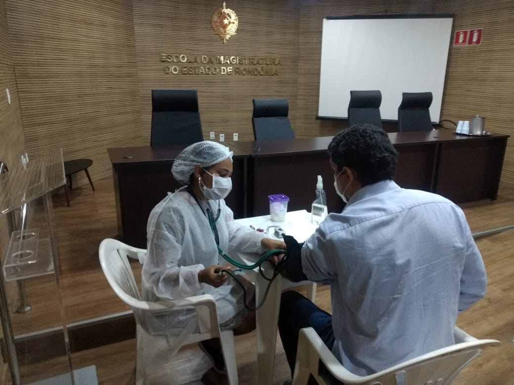 Também aconteceu hoje, no auditório da sede da Emeron, ação da Divisão de Saúde (Disau) do Tribunal de Justiça, com aferição de pressão arterial e frequência cardíaca, em alusão ao Dia Nacional de Prevenção e Combate à Hipertensão Arterial, celebrado em 26 de abril. Foi atendido todo o público interno da Emeron, incluindo servidores(as), estagiários(as) e terceirizados(as), além dos participantes da formação em Constelações Familiares.