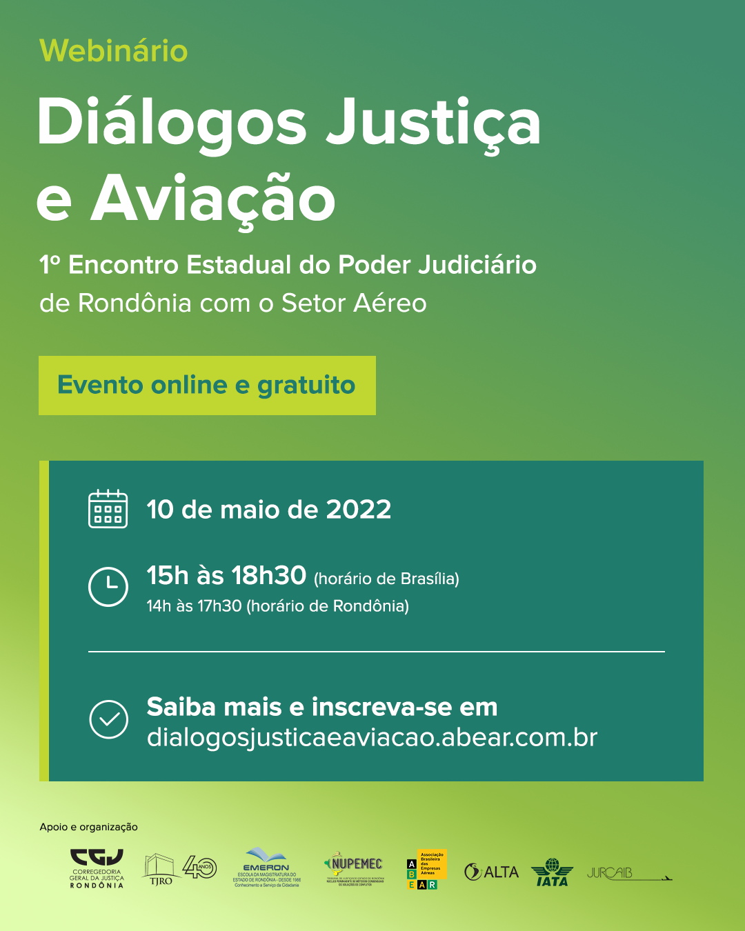 A Escola da Magistratura do Estado de Rondônia (Emeron) organiza a realização do 1º Encontro Estadual do Poder Judiciário de Rondônia com o Setor Aéreo, no dia 10 de maio, das 14h às 17h30 (horário de RO), com transmissão online no site do evento (http://www.dialogosjusticaeaviacao.abear.com.br). As inscrições, gratuitas, já podem ser feitas pelo site.