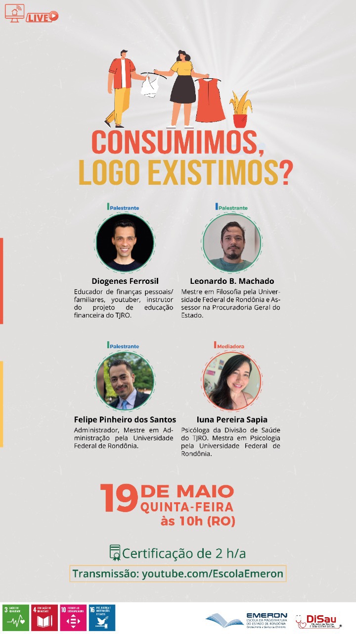 No próximo dia 19, às 10h (hora RO), a Escola da Magistratura de Rondônia (Emeron) e a Divisão de Saúde (Disau), do Tribunal de Justiça do Estado, realizam mais uma live do projeto Saúde Financeira. Intitulada “Consumimos, logo existimos?” e voltada à sociedade em geral, a transmissão ocorre no canal da Emeron (youtube.com/EscolaEmeron), com certificação de 2 horas-aula a todas as pessoas que preencherem a frequência indicada na descrição do vídeo durante o evento.
