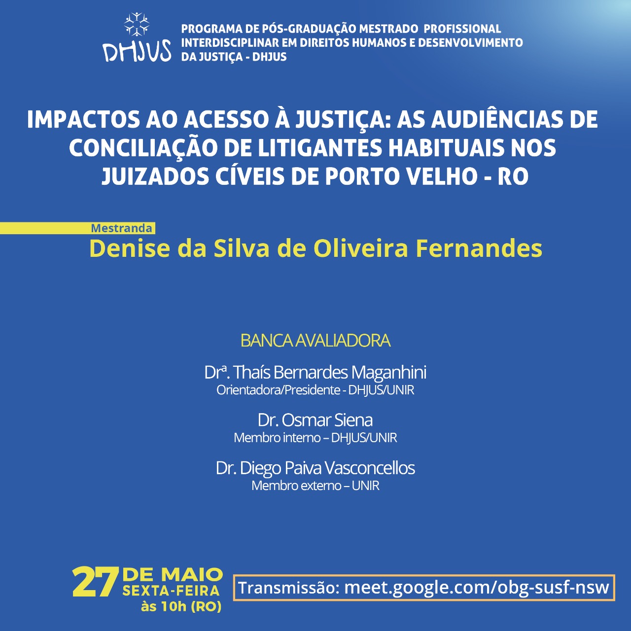 A primeira delas, às 10h da manhã, será a do DHJUS. A mestranda Denise da Silva de Oliveira Fernandes apresentará o estudo “Impactos ao Acesso à Justiça: As audiências de conciliação de litigantes habituais nos Juizados Cíveis de Porto Velho – RO”, realizado sob a orientação da professora doutora Thaís Bernardes Maganhini. Também fazem parte da banca os professores doutores Osmar Siena, docente do DHJUS, e Diego Paiva Vasconcellos, da Unir. O link de acesso é: meet.google.com/obg-susf-nsw