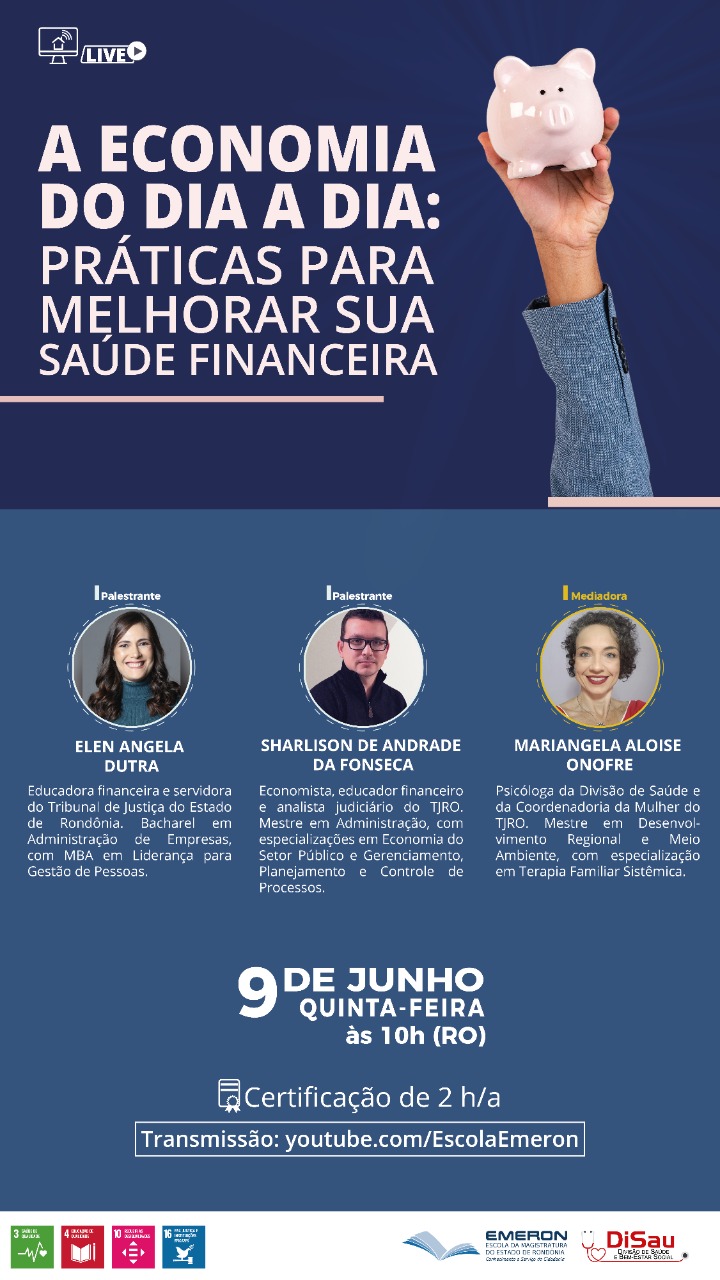 O projeto Saúde Financeira, realizado pela Divisão de Saúde (DiSau) do Tribunal de Justiça de Rondônia desde 2014 e que teve suas atividades retomadas em abril, promoverá a última live do semestre na próxima quinta-feira, dia 9 de junho. A partir das 10h (hora de RO), no canal de YouTube da Escola da Magistratura do Estado (Emeron), educadores financeiros do TJRO ministrarão o seminário “A Economia do Dia a Dia: Práticas para melhorar sua saúde financeira”.