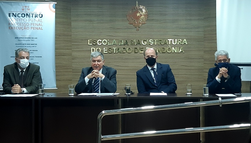 Durante a abertura do Encontro sobre Direito Penal, Processo Penal e Execução Penal, na última terça-feira (28), no auditório da Escola da Magistratura de Rondônia (Emeron), participaram o presidente do Tribunal de Justiça de Rondônia, desembargador Marcos Alaor Diniz Grangeia; o corregedor-geral da Justiça, desembargador José Antonio Robles; o desembargador Francisco Borges, professor de Processo Penal na Emeron e que representou o diretor da Escola, desembargador Raduan Miguel Filho; e o coordenador do Encontro, desembargador José Jorge Ribeiro da Luz. Destinado a 50 magistradas e magistrados que atuam na competência criminal e de execução penal do TJRO, o evento foi dividido em duas etapas.